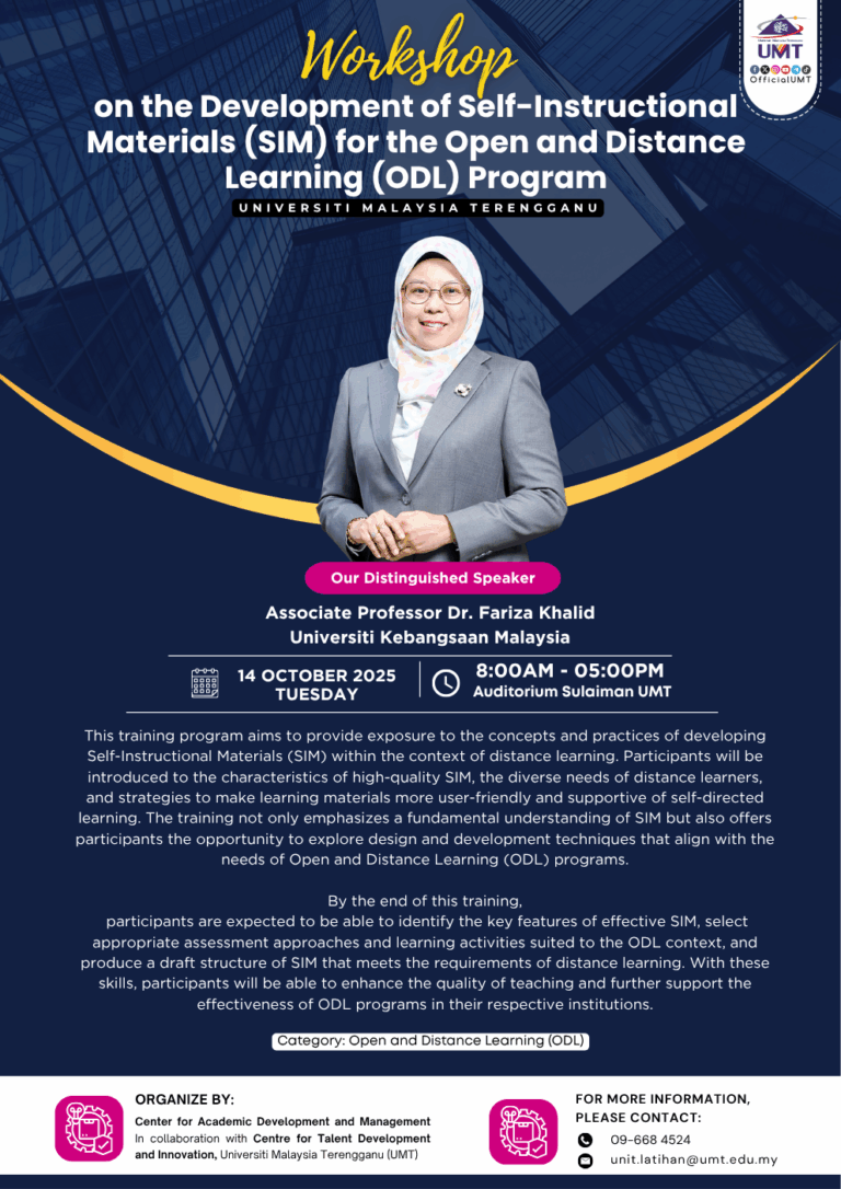 e-Learning UMT responsible for managing the implementation of digital learning at Universiti Malaysia Terengganu. It includes the provision and management of the entire e-Learning platform at the University and the development of content related to teaching and learning.